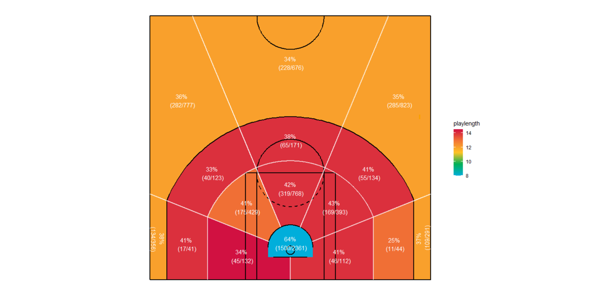 ショットクロックで見るヒューストン・ロケッツのフィールドショットの分布は下記の通り。分布図の見方はこちら。