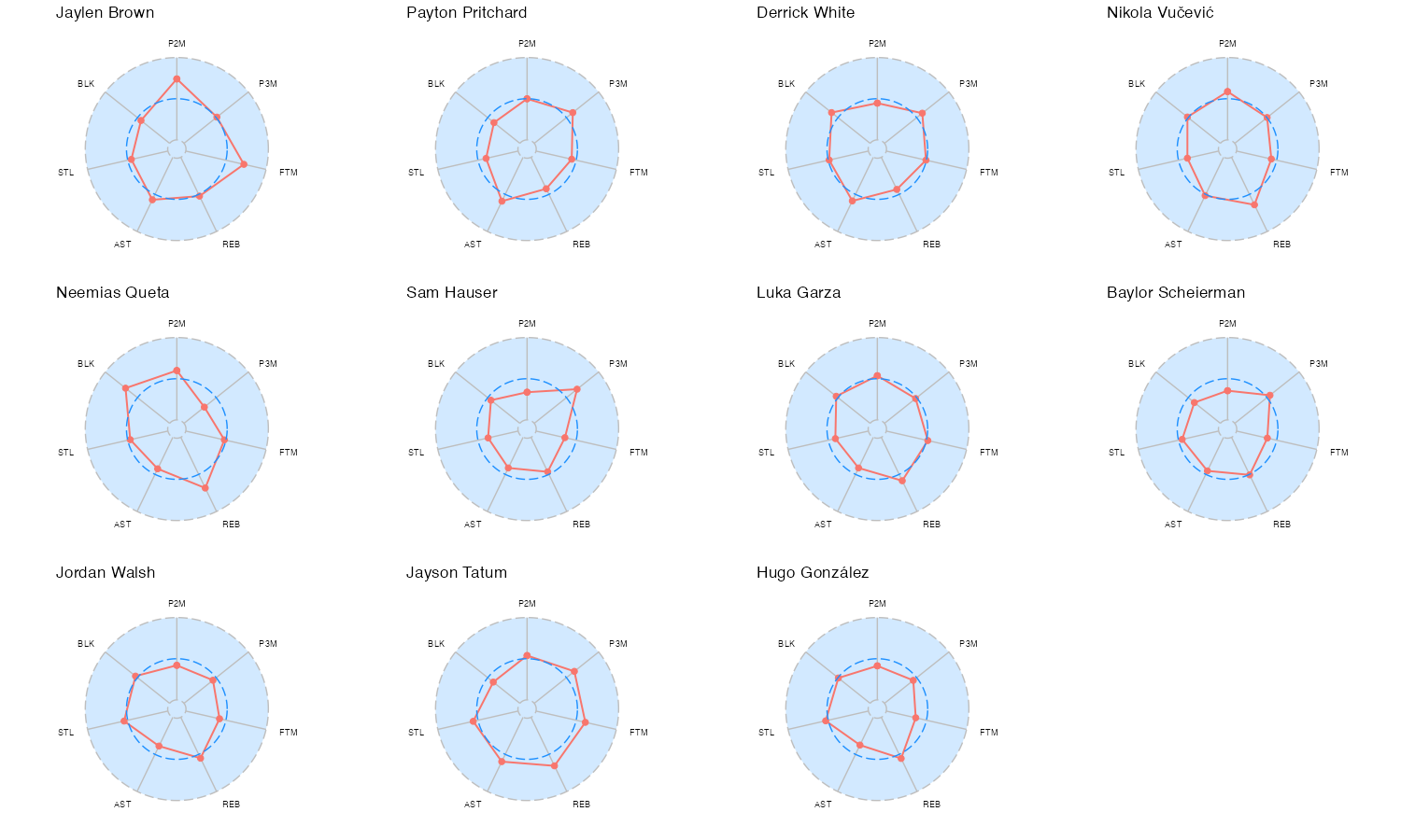 ボストン・セルティックスの所属プレイヤーのレーダーチャートは下記の通り。レーダーチャートの見方はこちら。基本スタッツの内容はこちら。