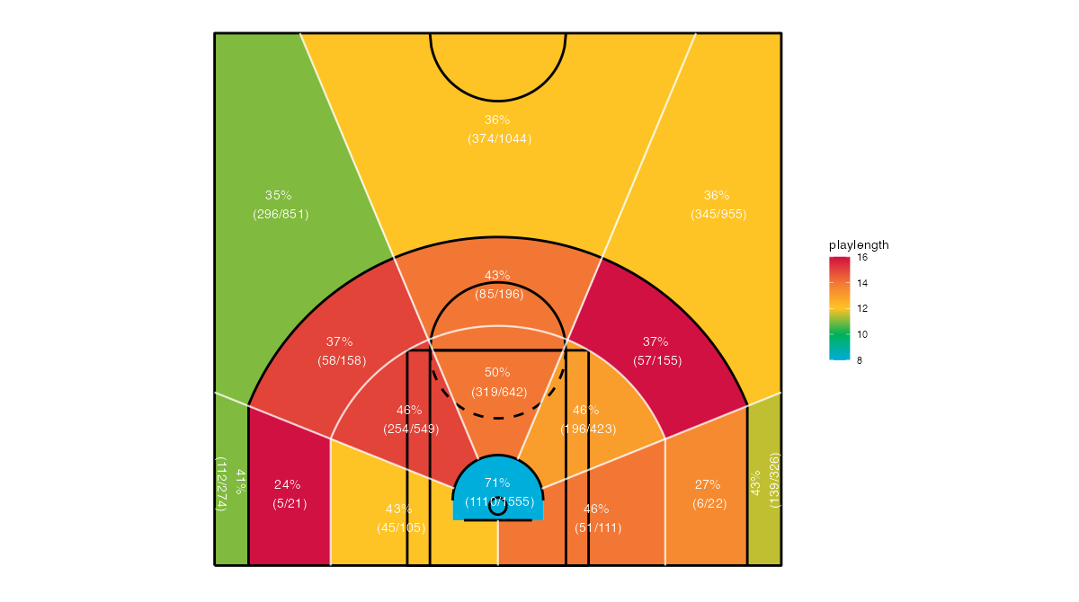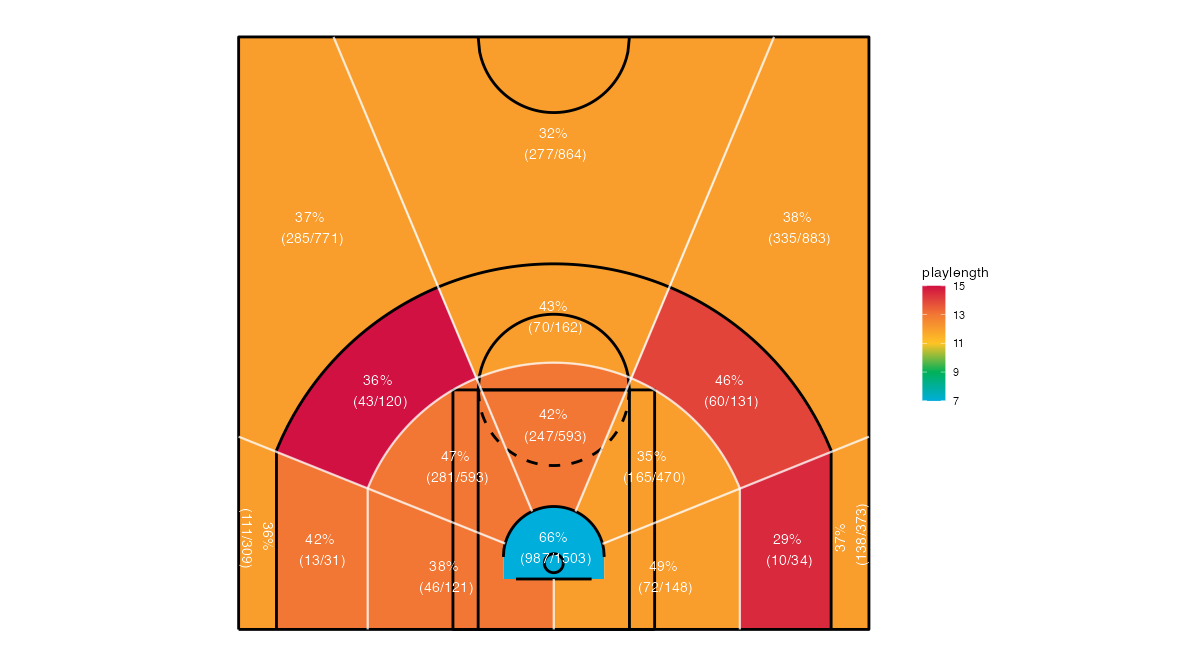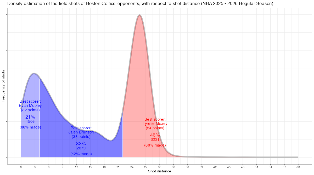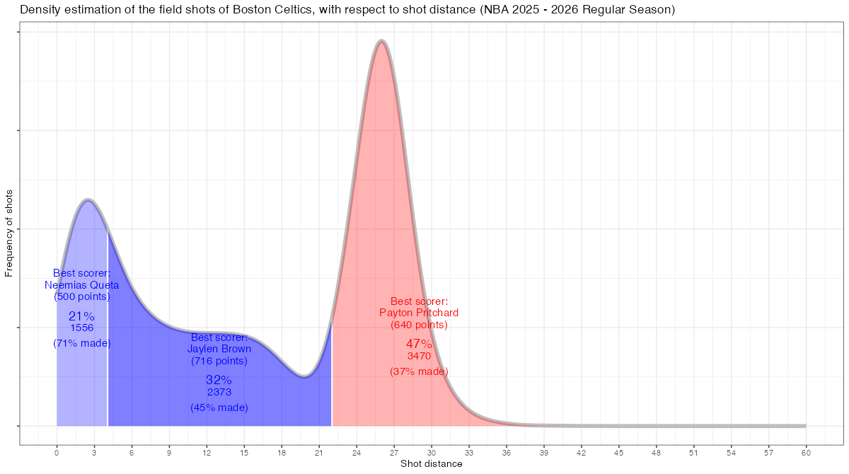 シュート距離で見るボストン・セルティックスのフィールドショットの分布は下記の通り。分布図の見方はこちら。