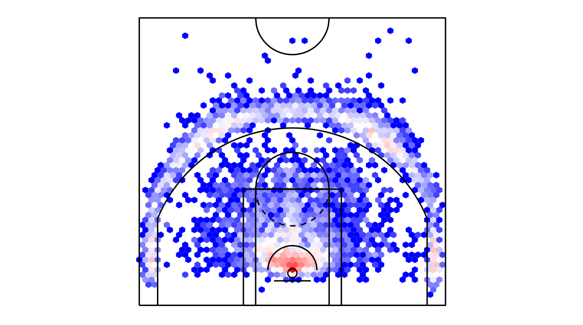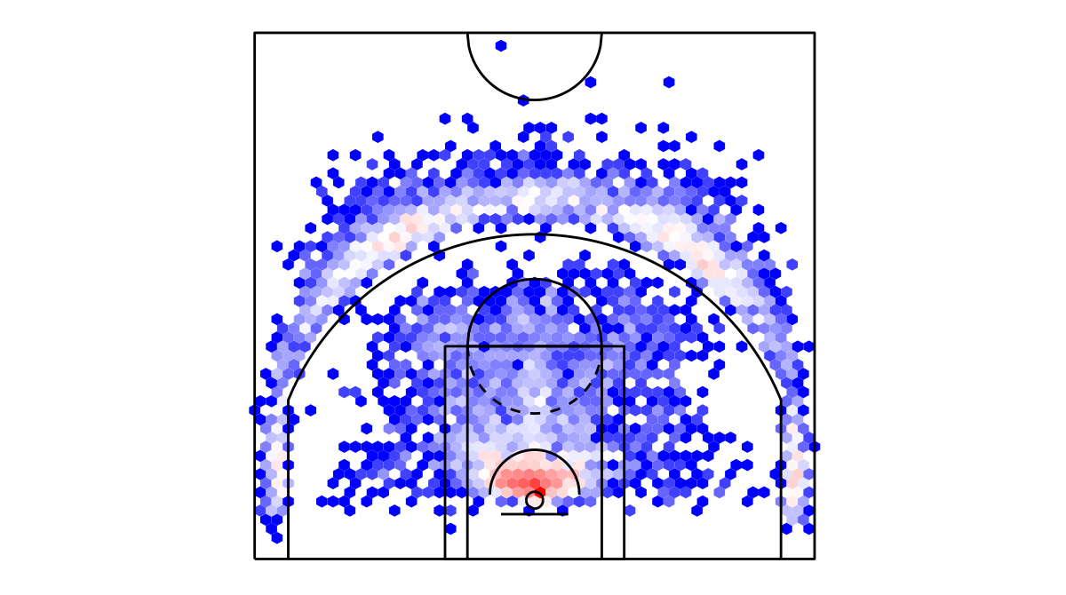 ヘックスビンマップ(Hexbin map)を用いたボストン・セルティックスのシュートチャートは下記の通り。シュートチャートの見方はこちら。
