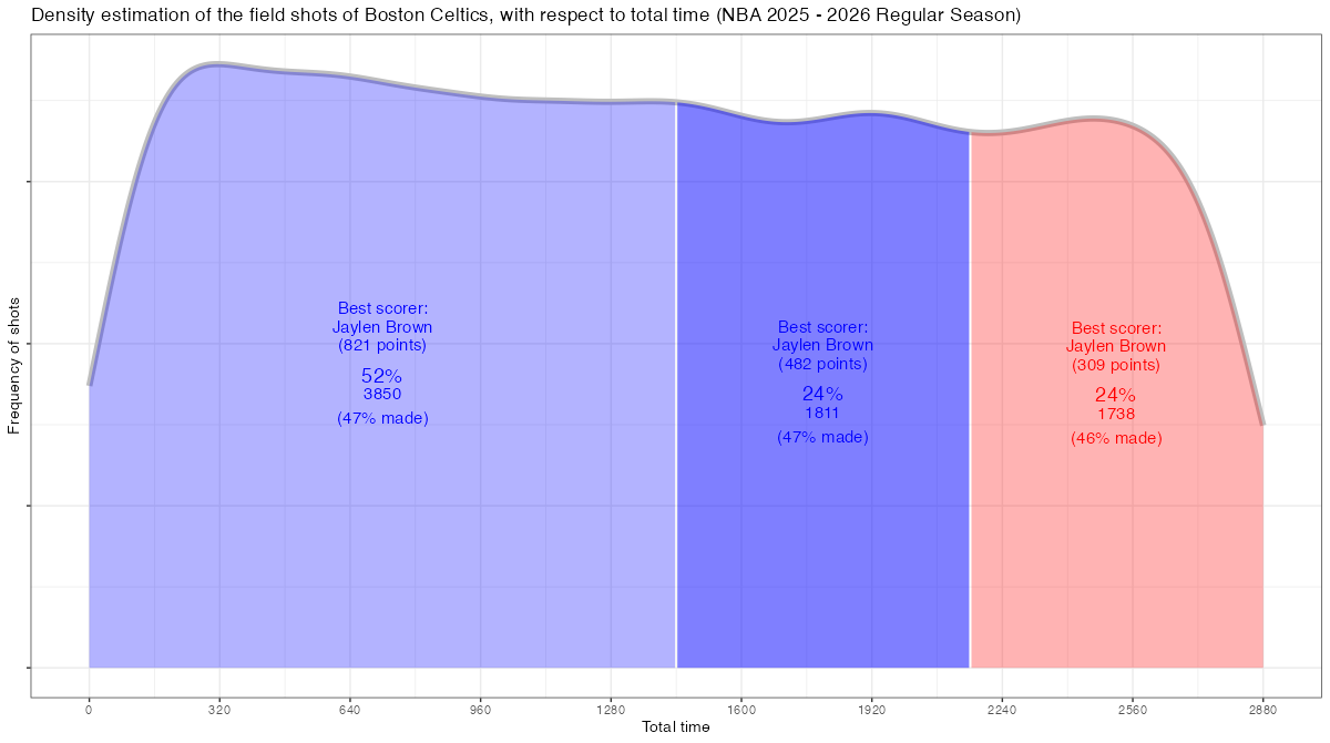 試合経過時間で見るボストン・セルティックスのフィールドショットの分布は下記の通り。分布図の見方はこちら。