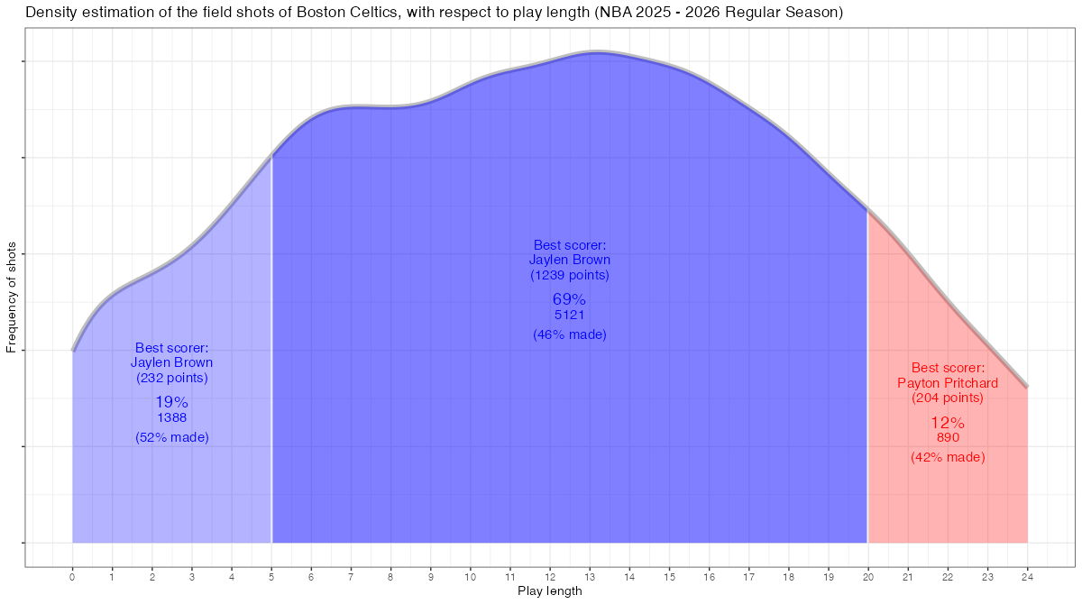 ショットクロックで見るボストン・セルティックスのフィールドショットの分布は下記の通り。分布図の見方はこちら。