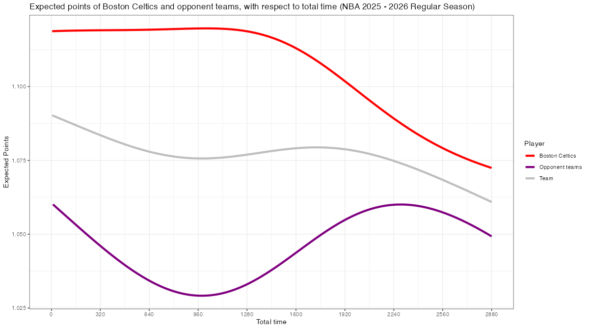 試合経過時間で見るボストン・セルティックスのスコアリング期待値の推移は下記の通り。分布図の見方はこちら。