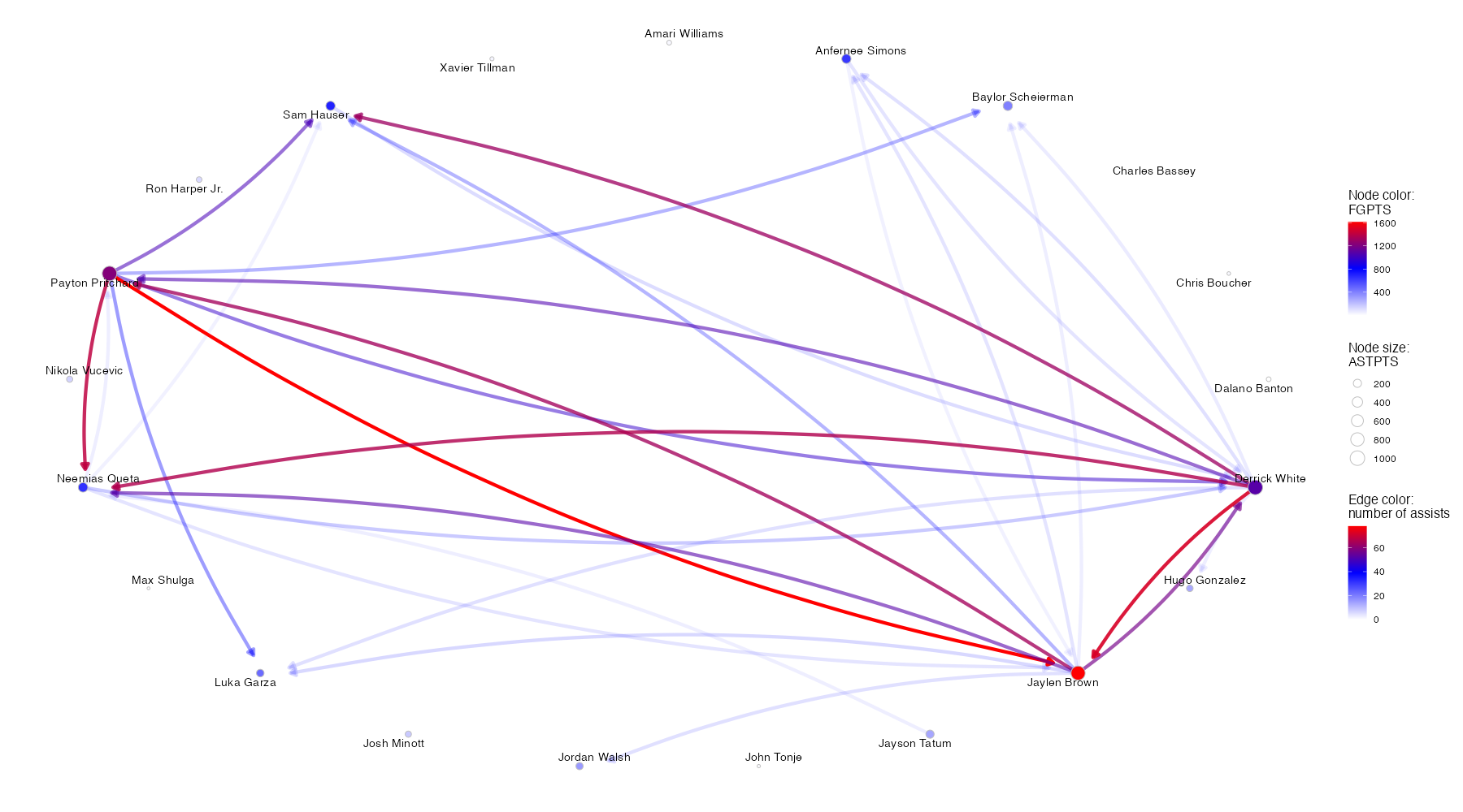 ※ノードの色はFGPTS(フィールドショットによる得点)、ノードのサイズはASTPTS(アシストにより生み出した得点)に対応している。エッジの始点はアシスト元のプレイヤー、終点はアシスト先のプレイヤー、エッジの色はアシスト数(アシスト数20以下となるエッジの表記は省略)に対応している。