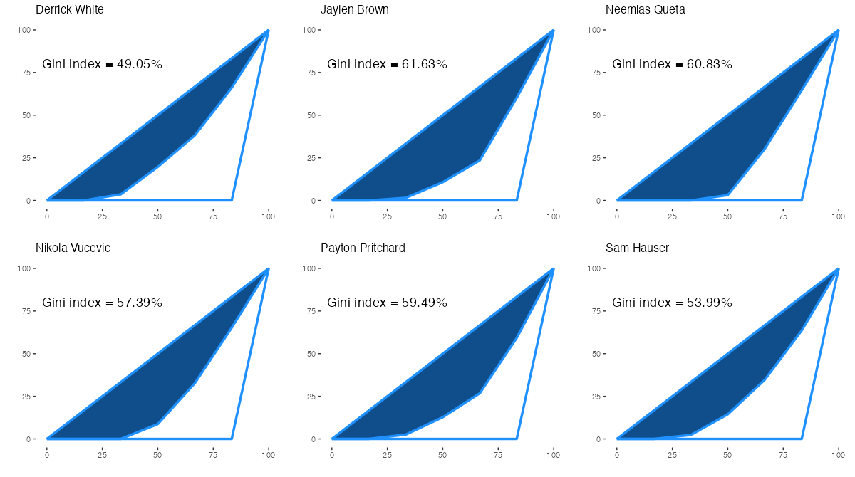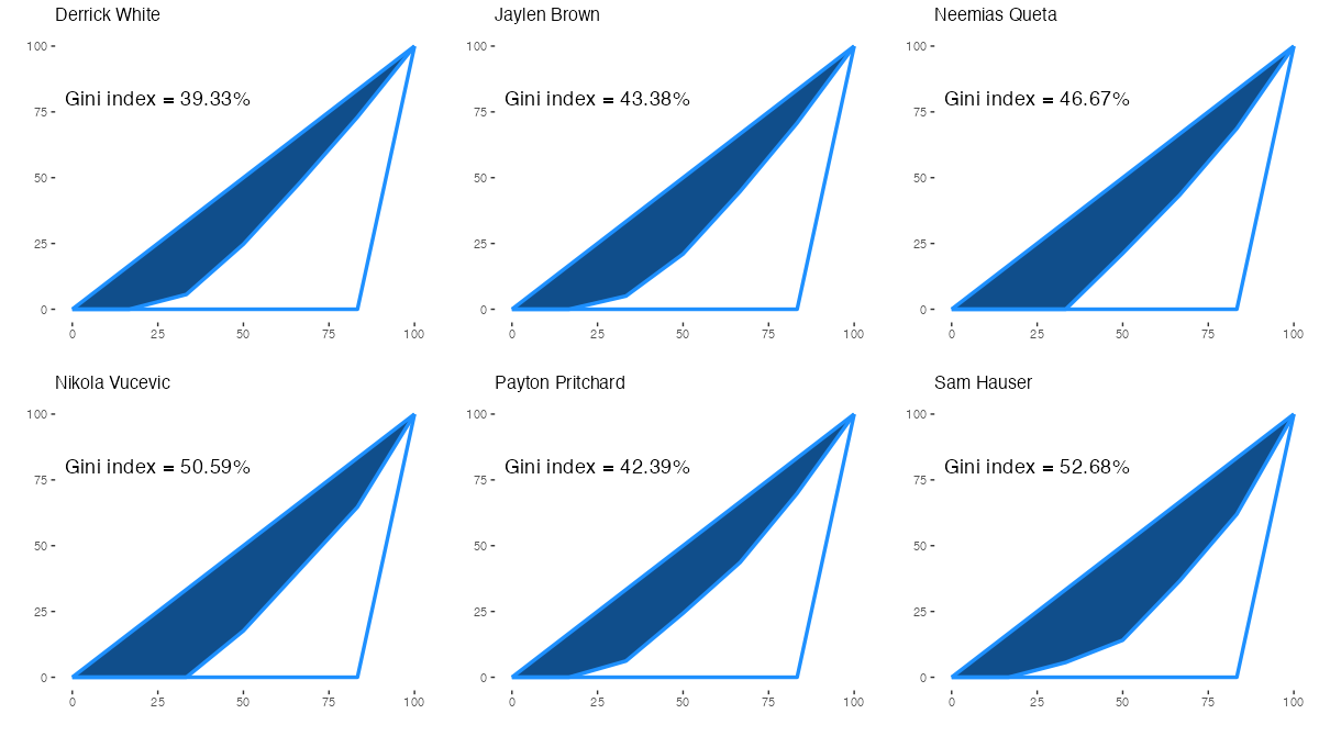ボストン・セルティックスの所属プレイヤーについて、アシストを出した相手先の偏りを表すジニ係数は下記の通り。ジニ係数の内容は過去記事を参照。