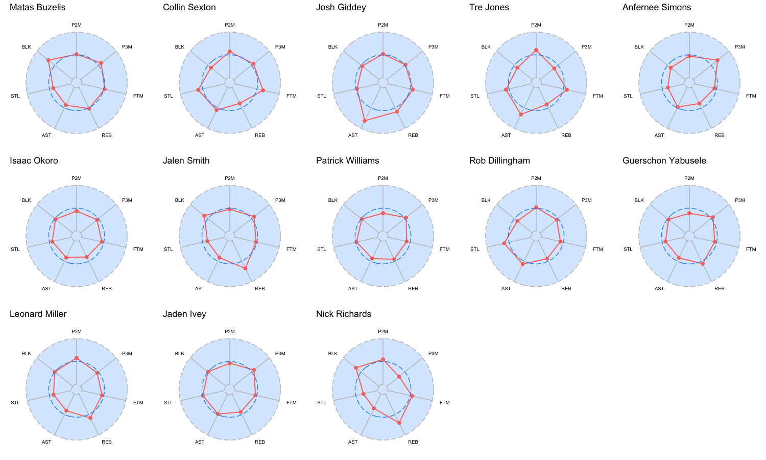シカゴ・ブルズの所属プレイヤーのレーダーチャートは下記の通り。レーダーチャートの見方はこちら。基本スタッツの内容はこちら。