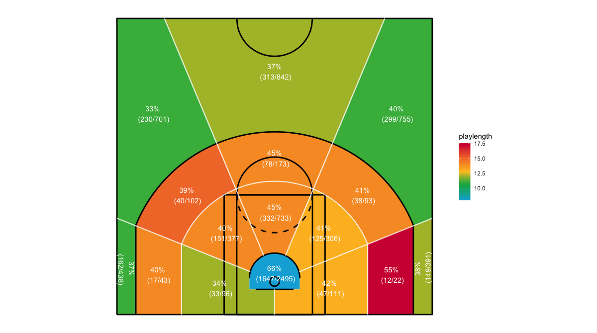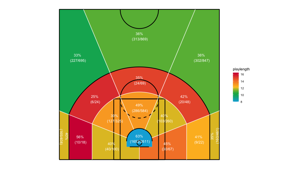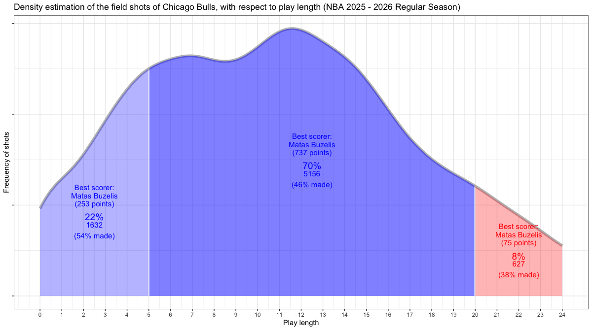 ショットクロックで見るシカゴ・ブルズのフィールドショットの分布は下記の通り。分布図の見方はこちら。