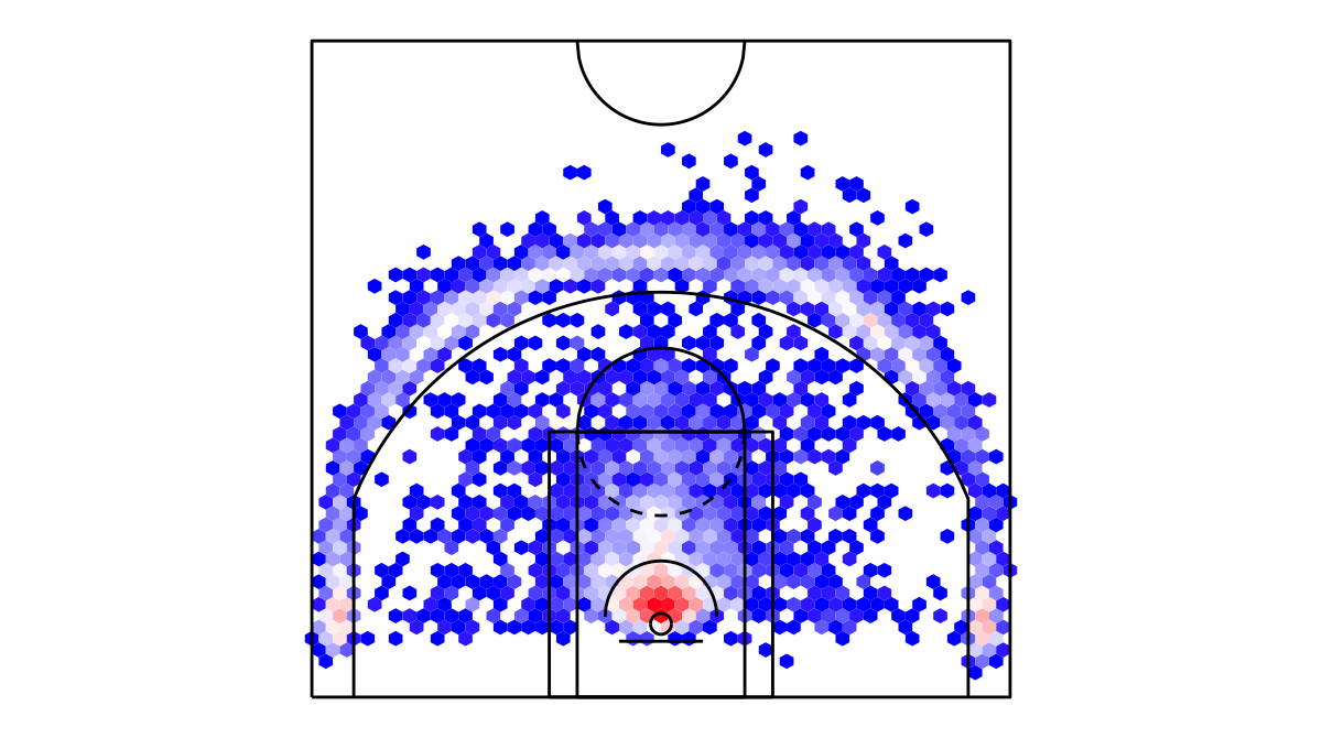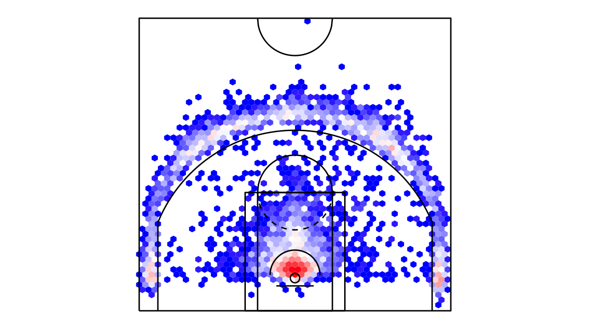 ヘックスビンマップ(Hexbin map)を用いたシカゴ・ブルズのシュートチャートは下記の通り。シュートチャートの見方はこちら。