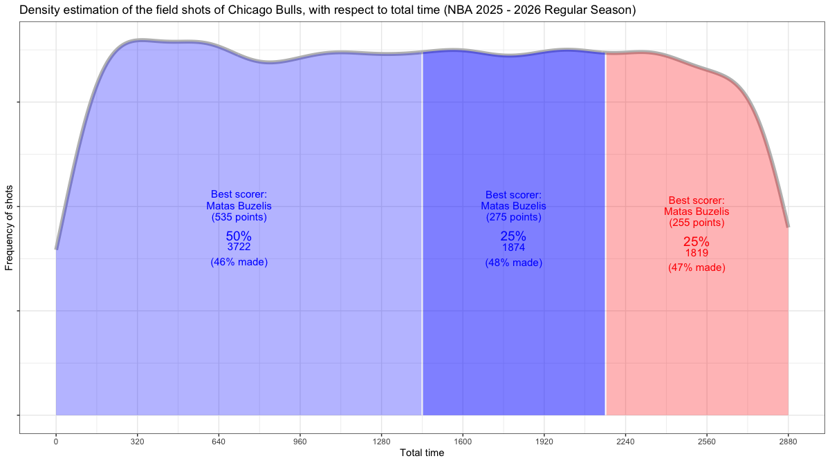 試合経過時間で見るシカゴ・ブルズのフィールドショットの分布は下記の通り。分布図の見方はこちら。