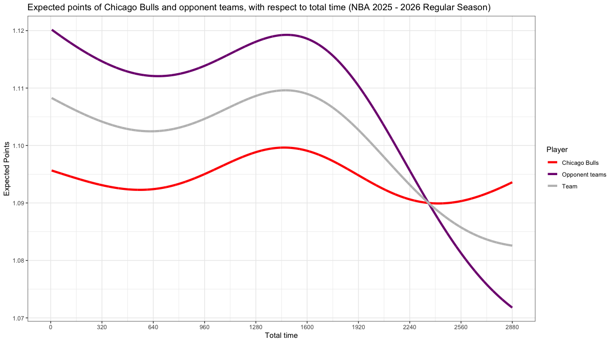 試合経過時間で見るシカゴ・ブルズのスコアリング期待値の推移は下記の通り。分布図の見方はこちら。