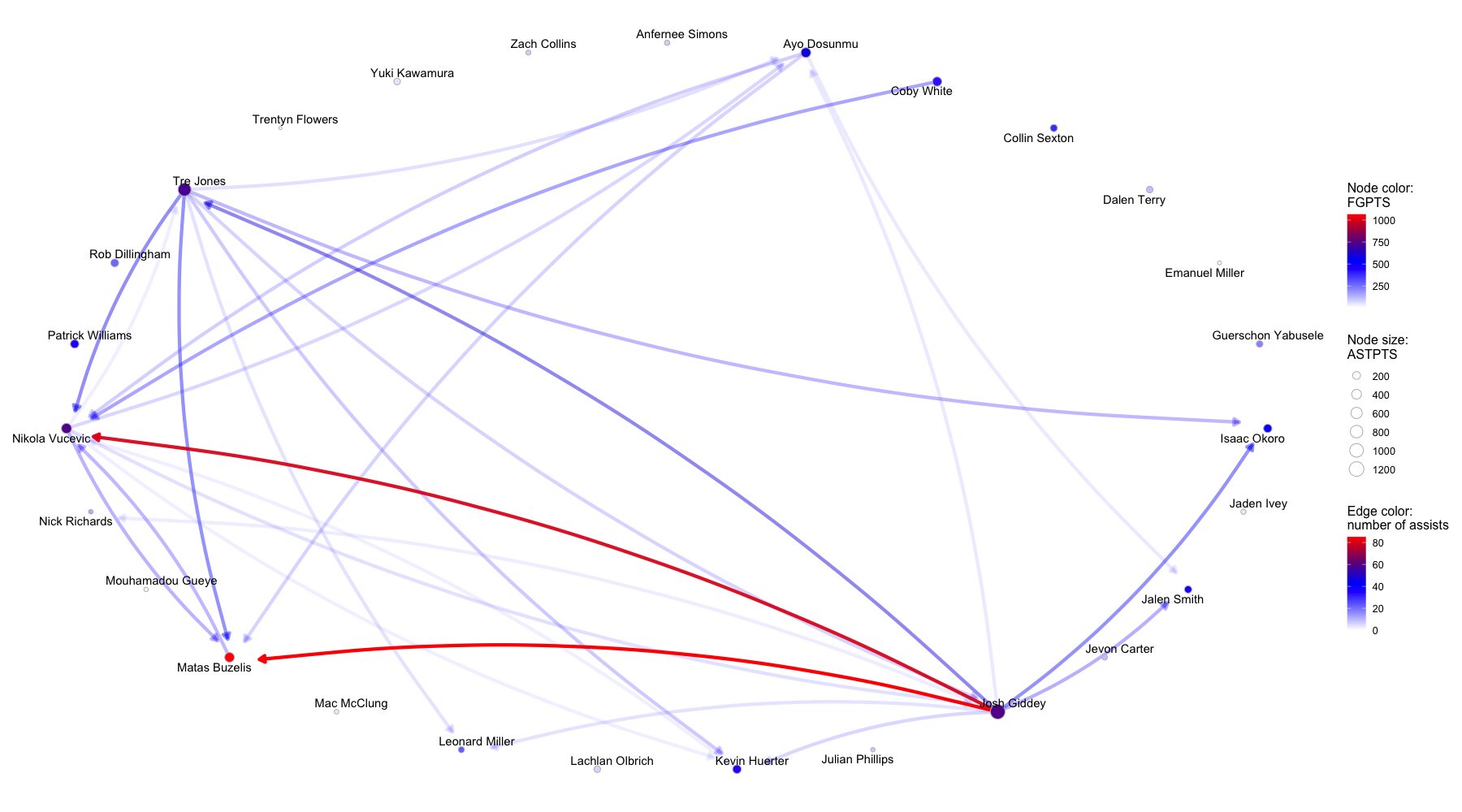 ※ノードの色はFGPTS(フィールドショットによる得点)、ノードのサイズはASTPTS(アシストにより生み出した得点)に対応している。エッジの始点はアシスト元のプレイヤー、終点はアシスト先のプレイヤー、エッジの色はアシスト数(アシスト数20以下となるエッジの表記は省略)に対応している。