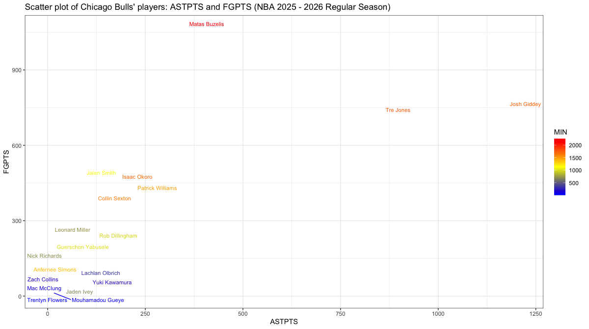 シカゴ・ブルズの所属プレイヤー(アルファベット順)のフィールドショットによる得点とアシスト関連スタッツは下記の通り。表中のFGPTS, FGPTS_AST, FGPTS_ASTp, AST, ASTPTSの内容はこちら。