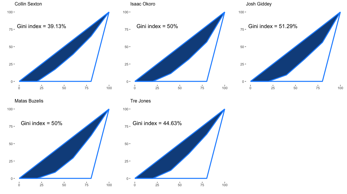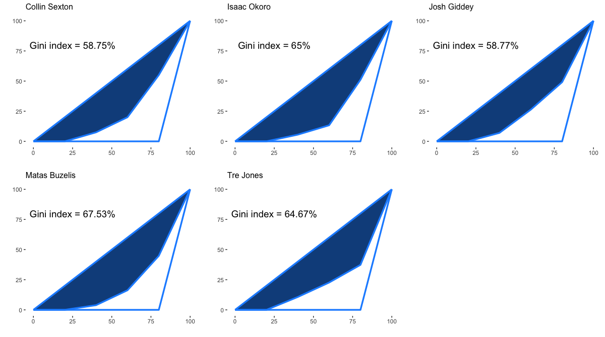 ※シーズンを通じて試合出場時間が1500MIN以上であるプレイヤーが対象。ジニ係数は0から1(0~100%)の間の値をとり、アシストを出した相手先の偏りが全く無い場合は0、その偏りが大きくなるにつれて1に近づく。