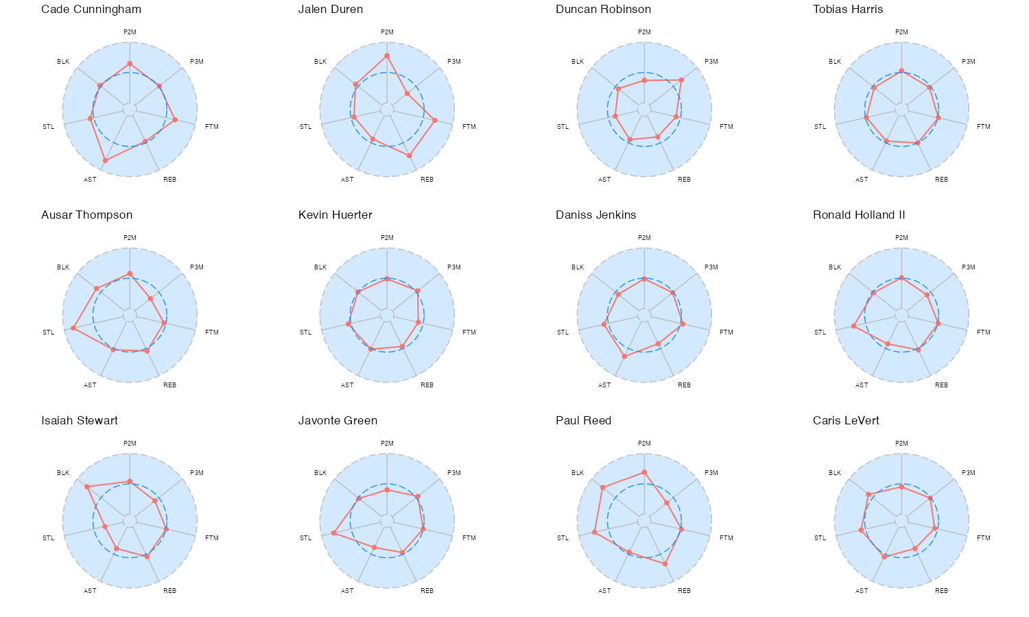 | Ausar Thompson | Cade Cunningham | Duncan Robinson | Jalen Duren | Kevin Huerter | Ronald Holland II | Tobias Harris | |
