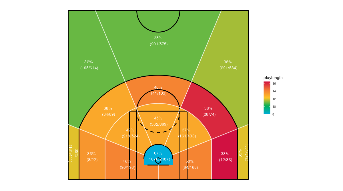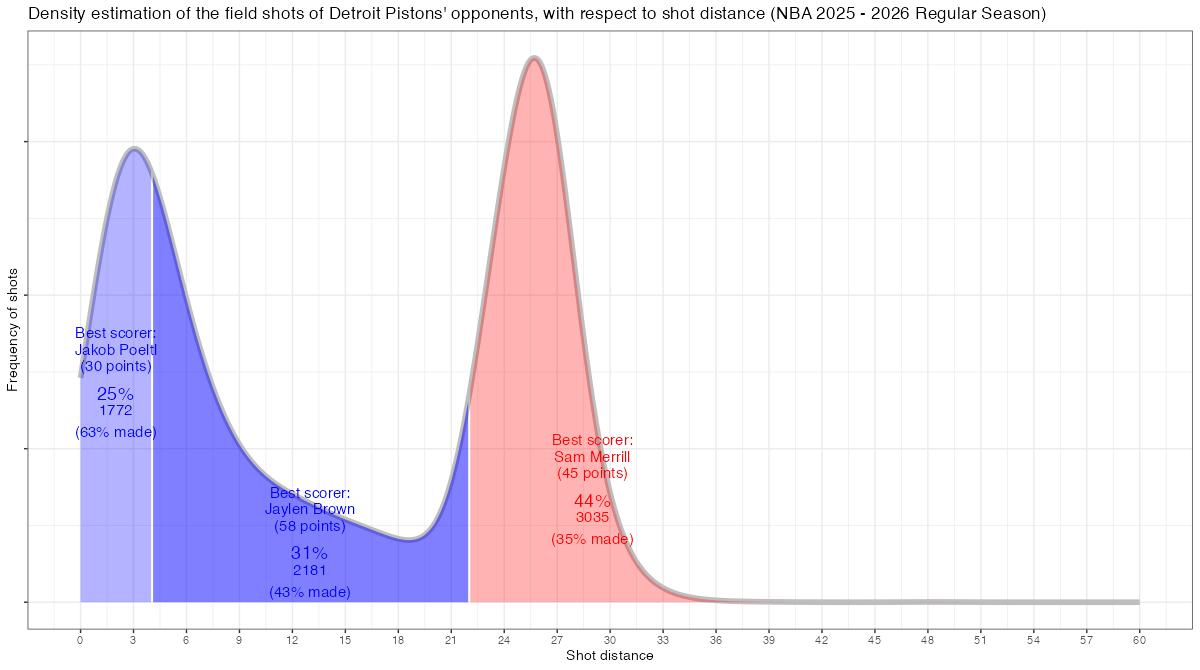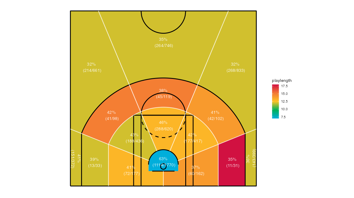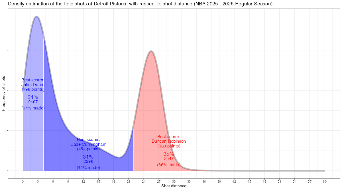 シュート距離で見るデトロイト・ピストンズのフィールドショットの分布は下記の通り。分布図の見方はこちら。