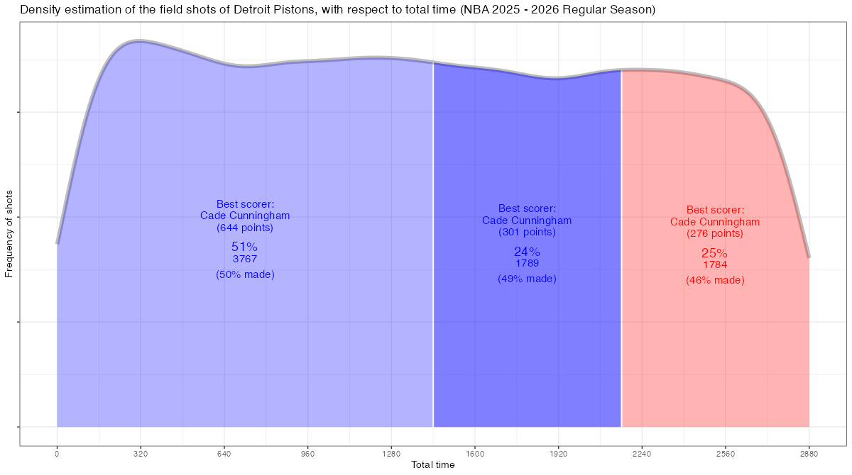 試合経過時間で見るデトロイト・ピストンズのフィールドショットの分布は下記の通り。分布図の見方はこちら。