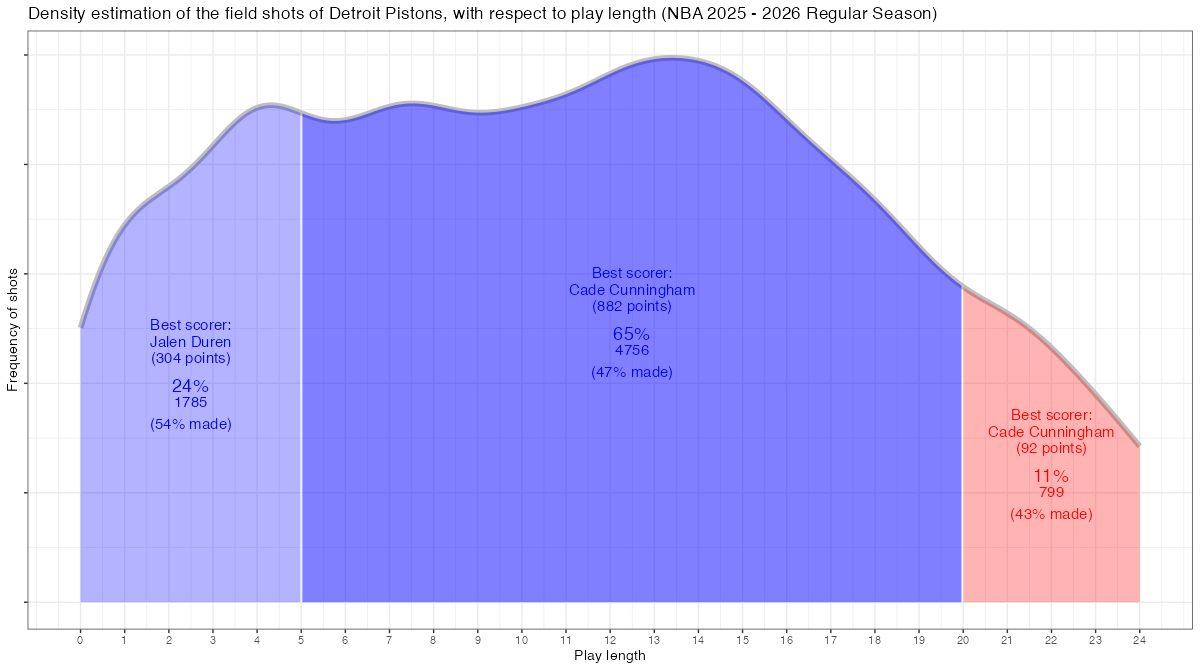 ショットクロックで見るデトロイト・ピストンズのスコアリング期待値の推移は下記の通り。分布図の見方はこちら。