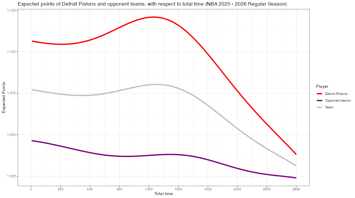 試合経過時間で見るデトロイト・ピストンズのスコアリング期待値の推移は下記の通り。分布図の見方はこちら。