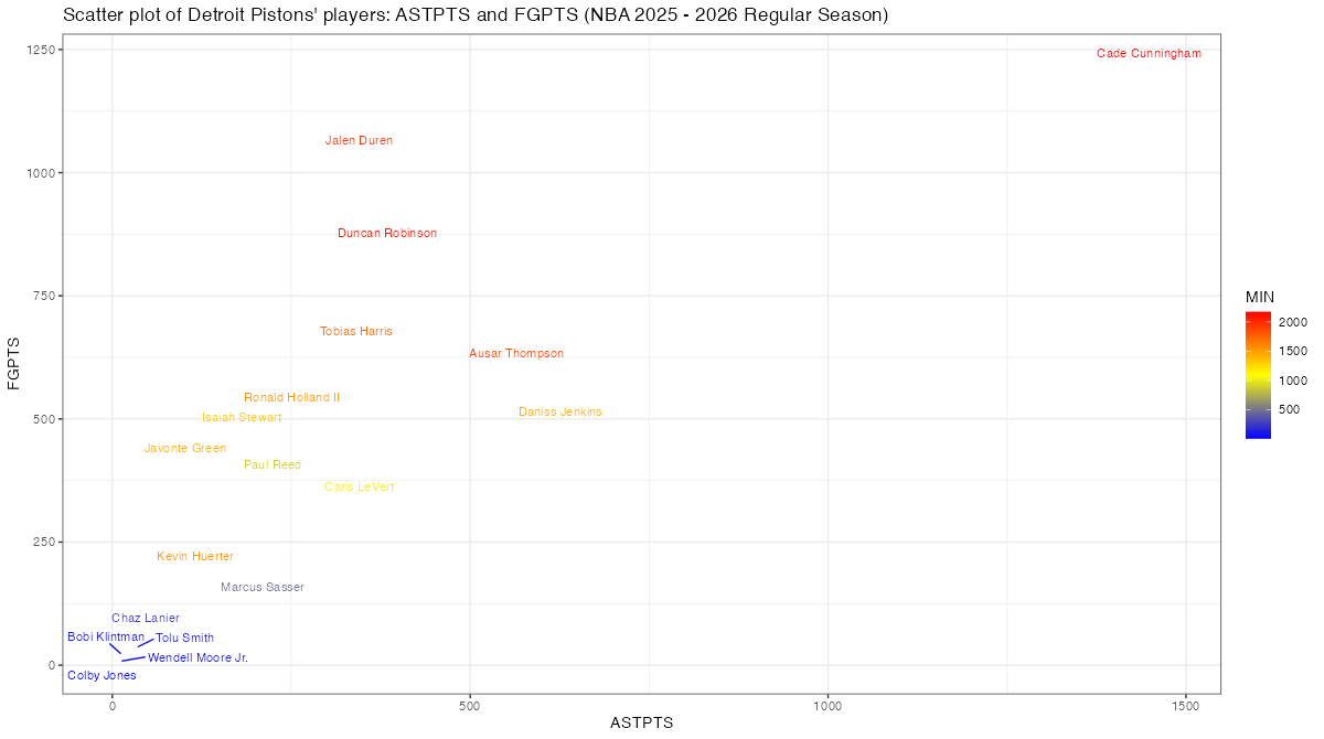 デトロイト・ピストンズの所属プレイヤー(アルファベット順)のフィールドショットによる得点とアシスト関連スタッツは下記の通り。表中のFGPTS, FGPTS_AST, FGPTS_ASTp, AST, ASTPTSの内容はこちら。