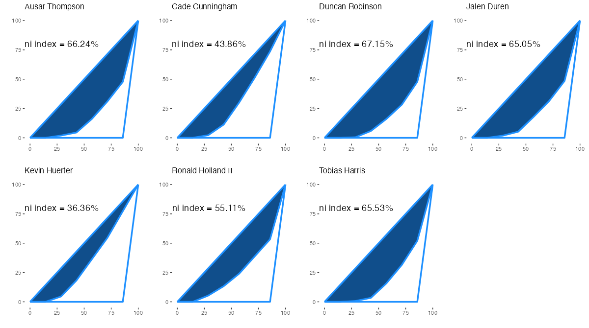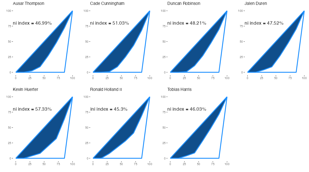 デトロイト・ピストンズの所属プレイヤーについて、アシストをもらった相手の偏りを表すジニ係数は下記の通り。ジニ係数の内容は過去記事を参照。