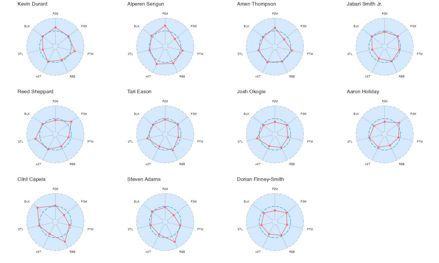 ヒューストン・ロケッツの所属プレイヤーのレーダーチャートは下記の通り。レーダーチャートの見方はこちら。基本スタッツの内容はこちら。