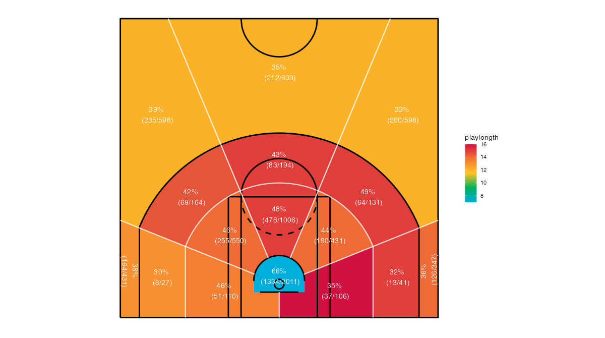 コートを16エリアに区分したヒューストン・ロケッツのシュートチャートは下記の通り。シュートチャートの見方はこちら。