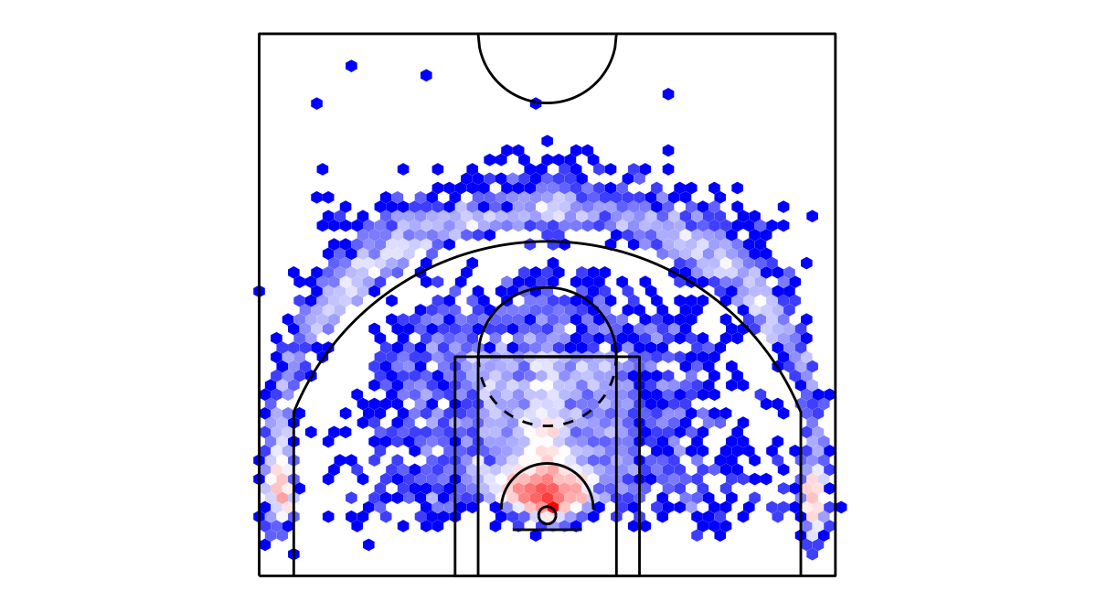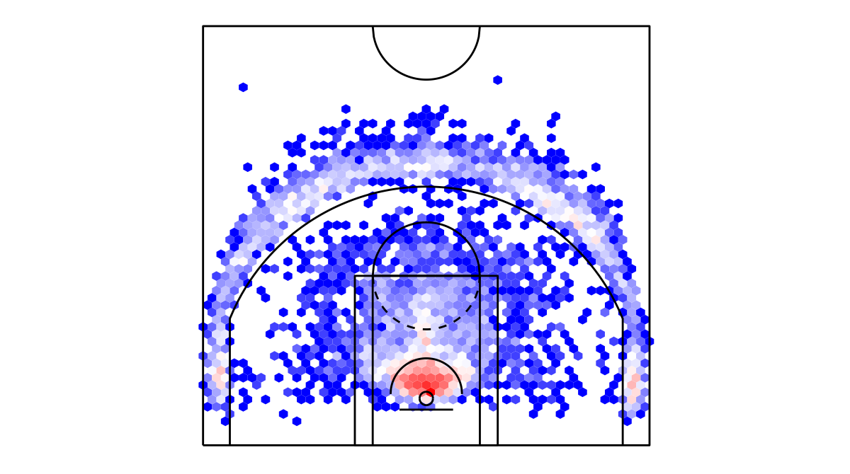 ヘックスビンマップ(Hexbin map)を用いたヒューストン・ロケッツのシュートチャートは下記の通り。シュートチャートの見方はこちら。