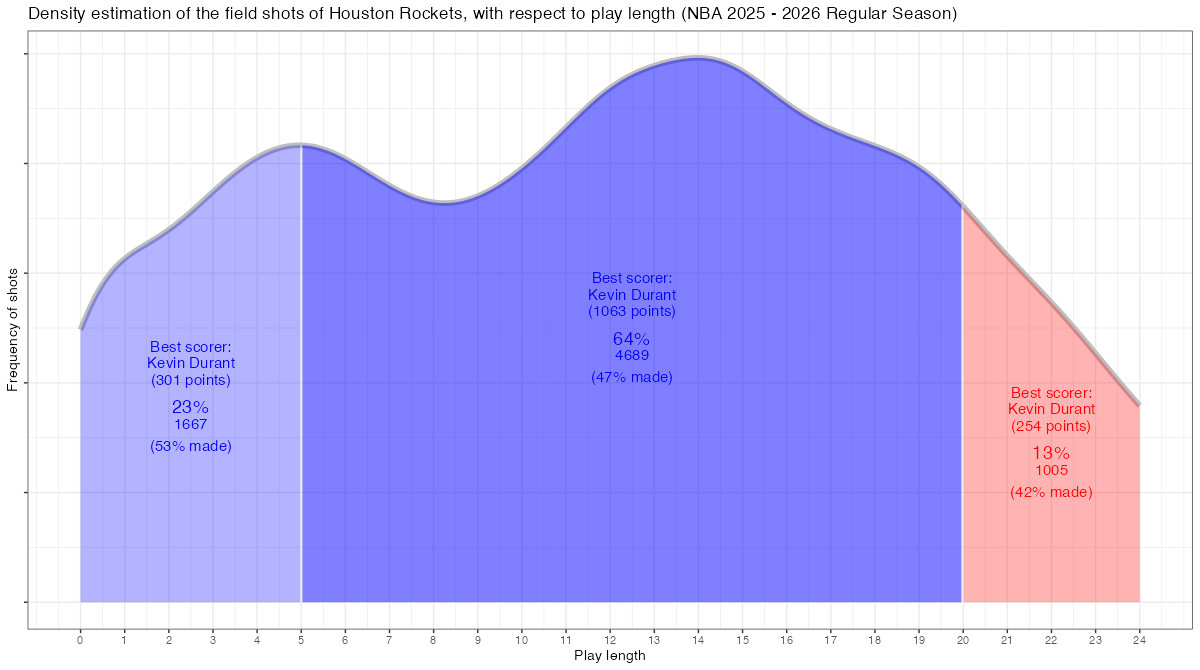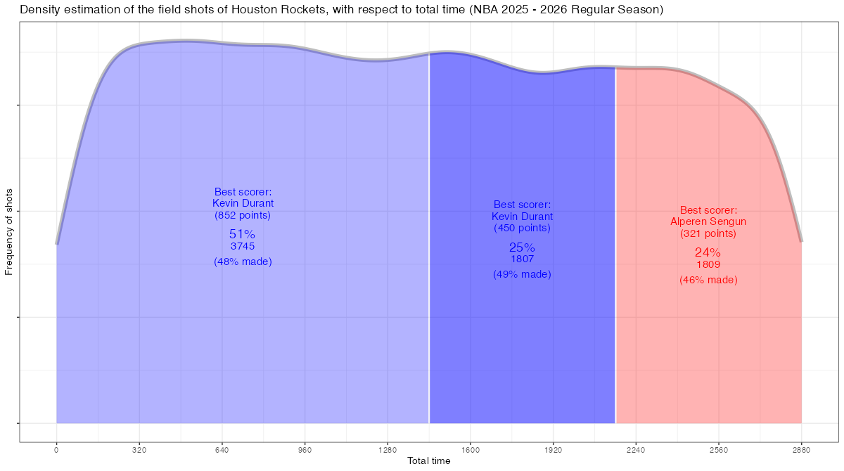 試合経過時間で見るヒューストン・ロケッツのフィールドショットの分布は下記の通り。分布図の見方はこちら。