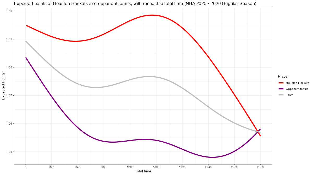 試合経過時間で見るヒューストン・ロケッツのスコアリング期待値の推移は下記の通り。分布図の見方はこちら。