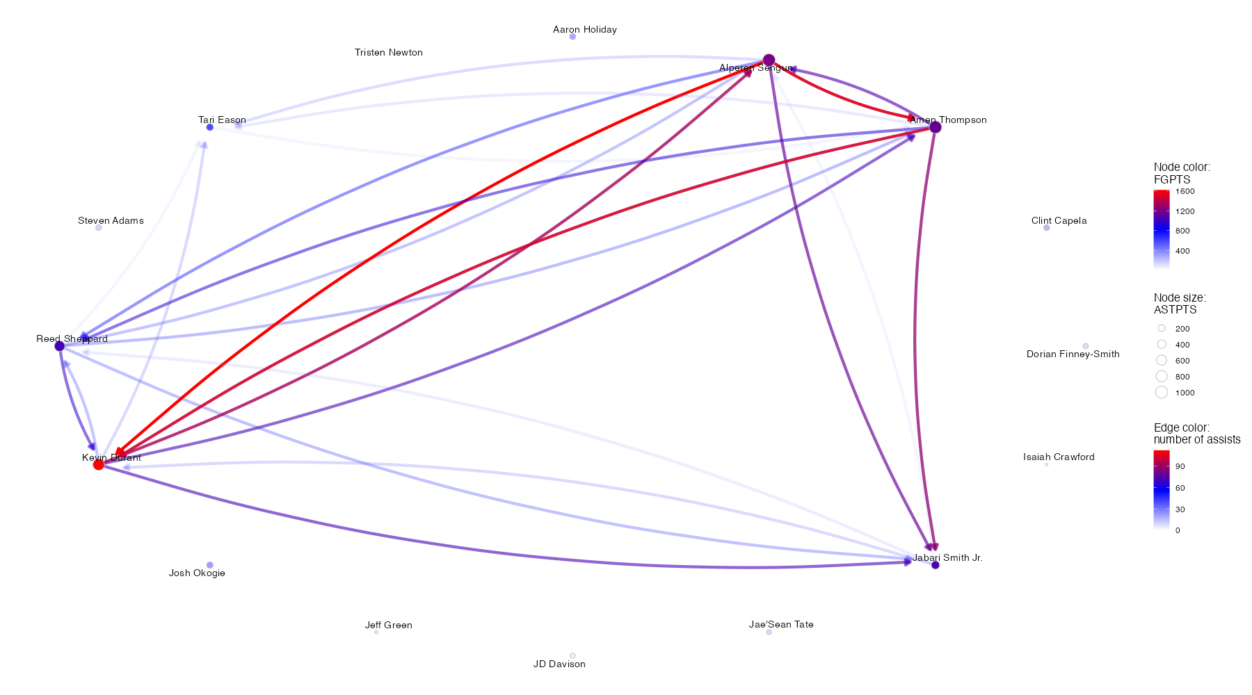 ※ノードの色はFGPTS(フィールドショットによる得点)、ノードのサイズはASTPTS(アシストにより生み出した得点)に対応している。エッジの始点はアシスト元のプレイヤー、終点はアシスト先のプレイヤー、エッジの色はアシスト数(アシスト数20以下となるエッジの表記は省略)に対応している。