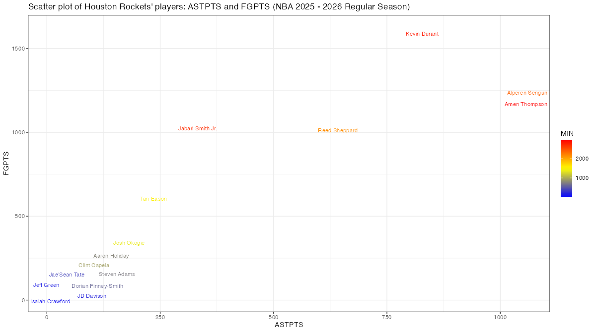 ヒューストン・ロケッツの所属プレイヤー(アルファベット順)のフィールドショットによる得点とアシスト関連スタッツは下記の通り。表中のFGPTS, FGPTS_AST, FGPTS_ASTp, AST, ASTPTSの内容はこちら。
