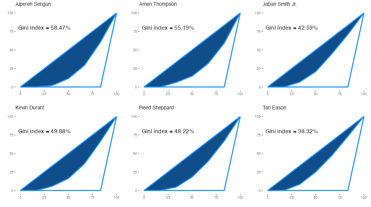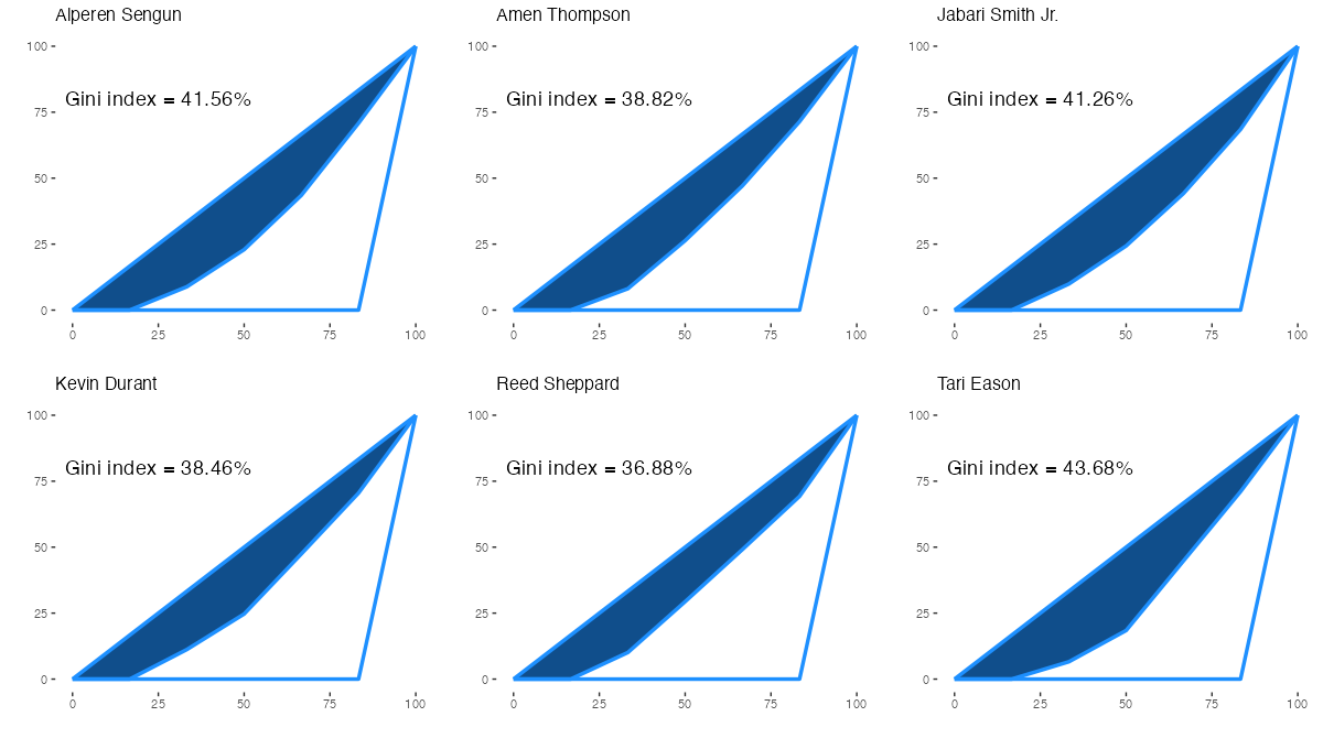 ヒューストン・ロケッツの所属プレイヤーについて、アシストを出した相手先の偏りを表すジニ係数は下記の通り。ジニ係数の内容は過去記事を参照。