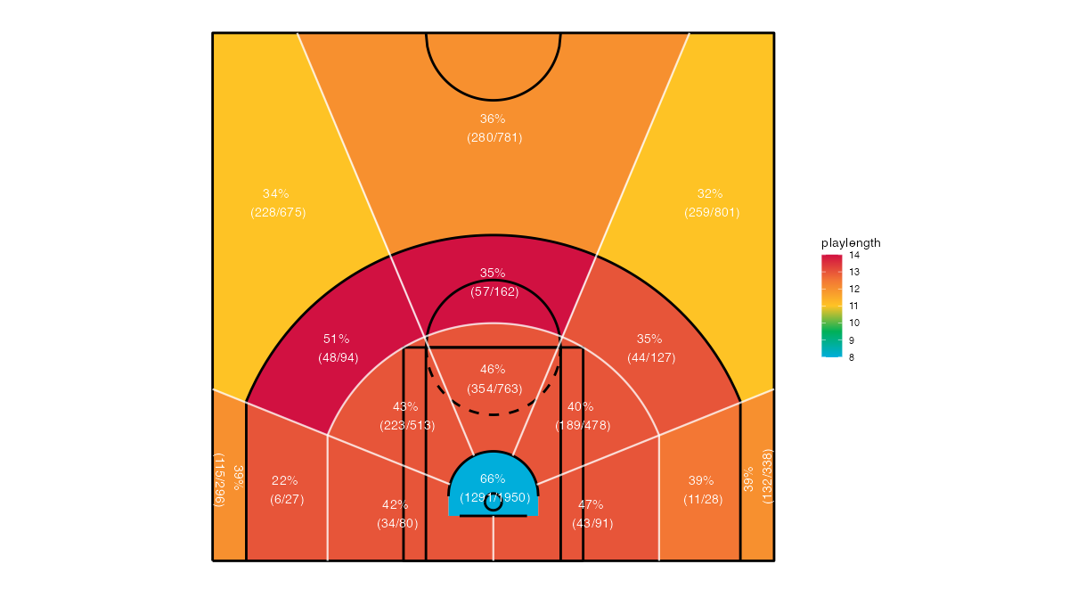 ショットクロックで見るヒューストン・ロケッツのフィールドショットの分布は下記の通り。分布図の見方はこちら。
