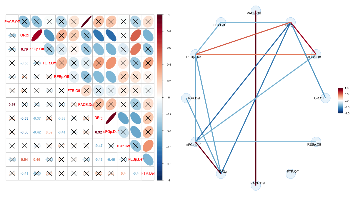 2. PACE, Ratings, Four Factors(eFG%、TO Ratio、REB%、FT Rate)を用いた相関行列