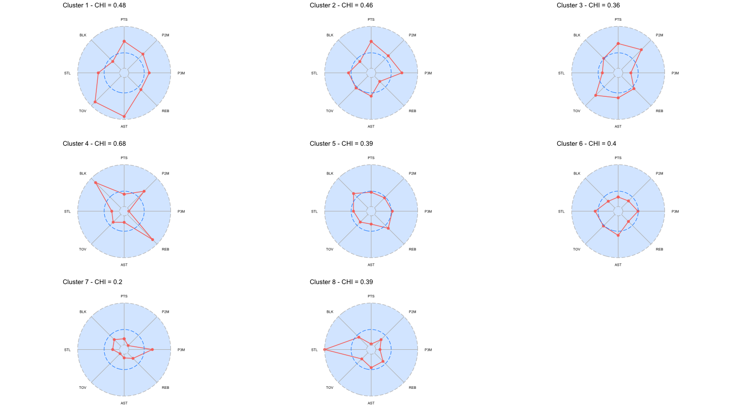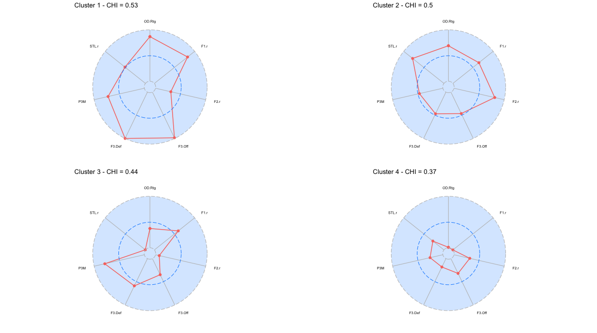 Radar chart and CHI per cluster <NBA 2025 – 2026 Regular season>