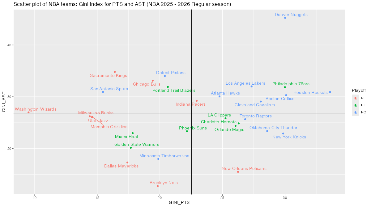 Gini index with respect to PTS and AST – NBA teams <NBA 2025 – 2026 Regular season>