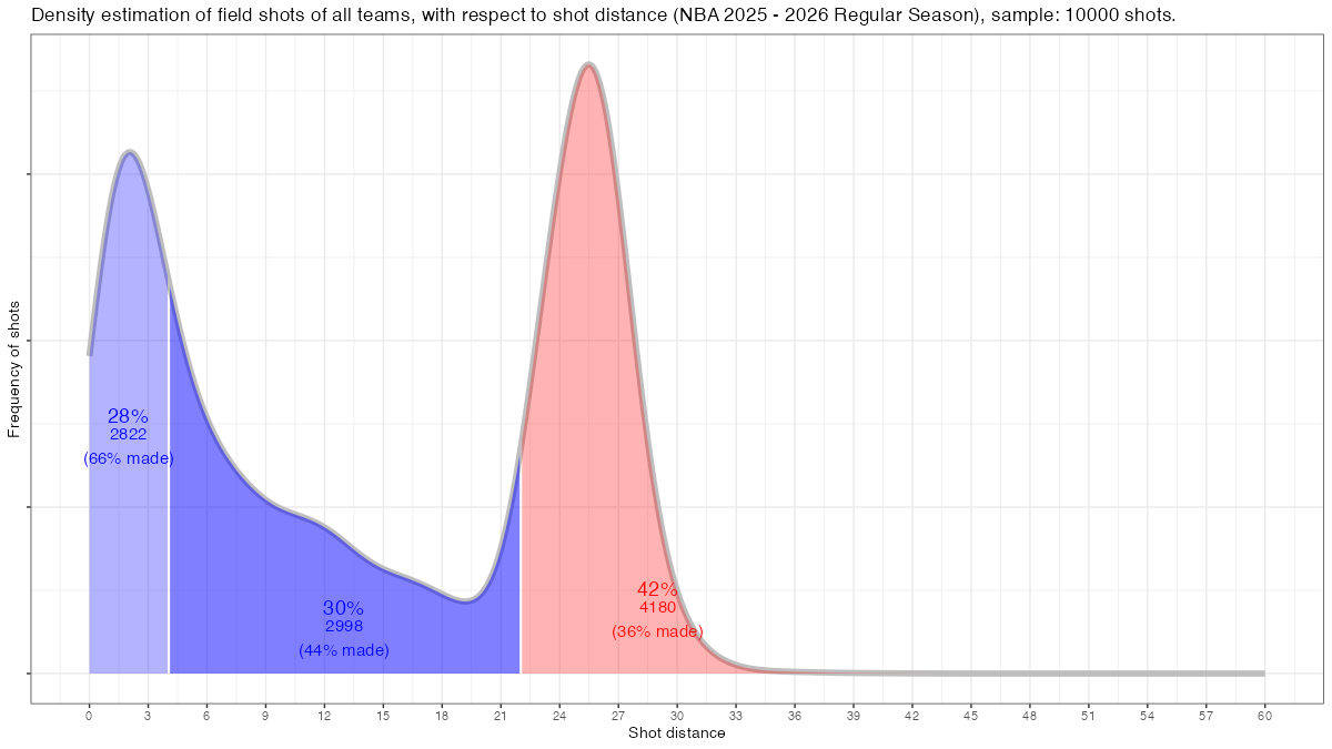 ※横軸にシュート距離(単位:フィート)、縦軸にシュート頻度をとっている。分布図内ではリング回りのシュートは薄紫色、ミドルレンジのシュートは紫色、3Pシュートは赤色でそれぞれ示されている。サンプル数はシュート10000本。