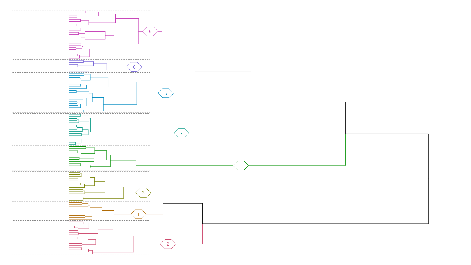クラスター分析によるNBAプレイヤーの分類は下記の通り。(※下記のデンドログラムの表示については、多数のプレイヤーが列挙されていることにより各プレイヤー名の判別が困難となっている。各クラスターに所属しているプレイヤーを確認するためのPDFファイルはこちら。)