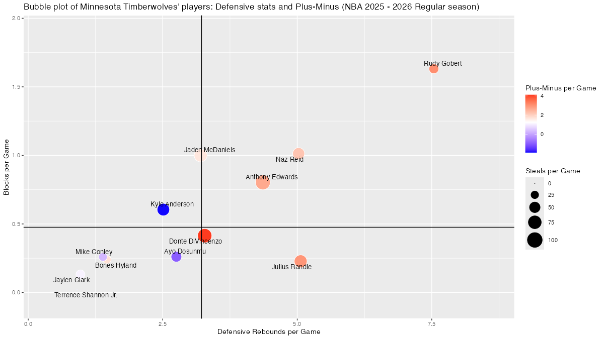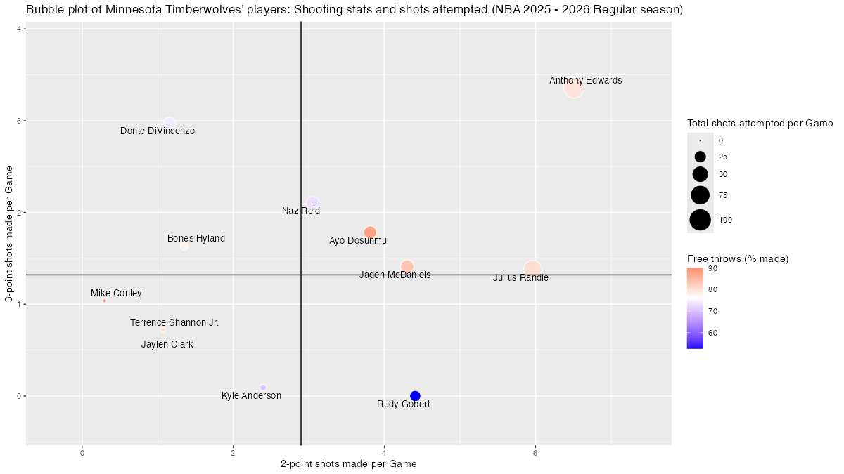 【ミネソタ・ティンバーウルブズ】基本スタッツを用いたプレイヤーのバブルチャート <NBA 2025 – 2026 Regular Season>