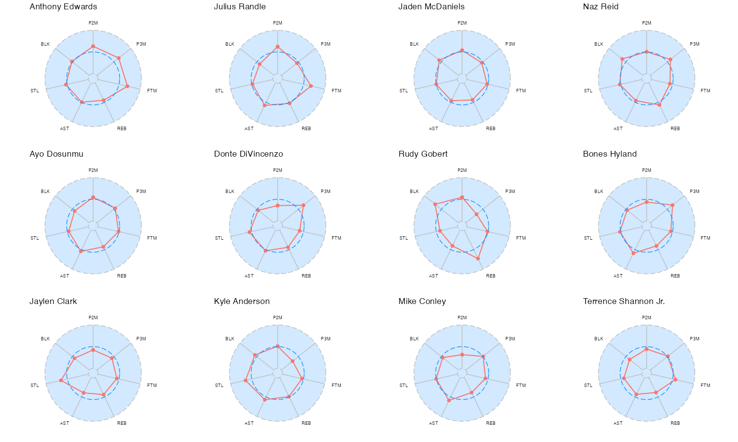 ミネソタ・ティンバーウルブズの所属プレイヤーのレーダーチャートは下記の通り。レーダーチャートの見方はこちら。基本スタッツの内容はこちら。