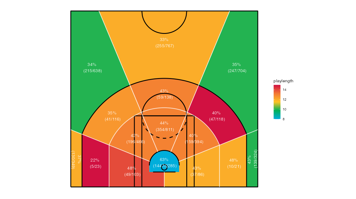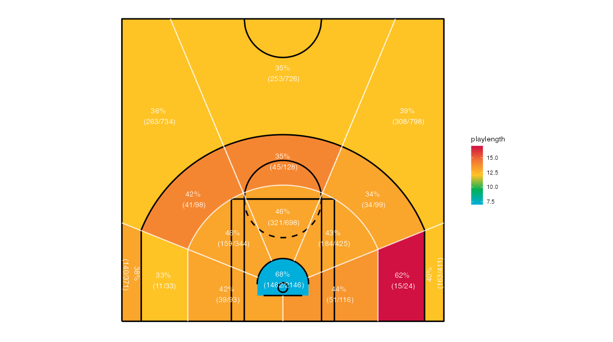 ショットクロックで見るミネソタ・ティンバーウルブズのフィールドショットの分布は下記の通り。分布図の見方はこちら。