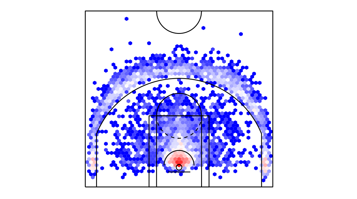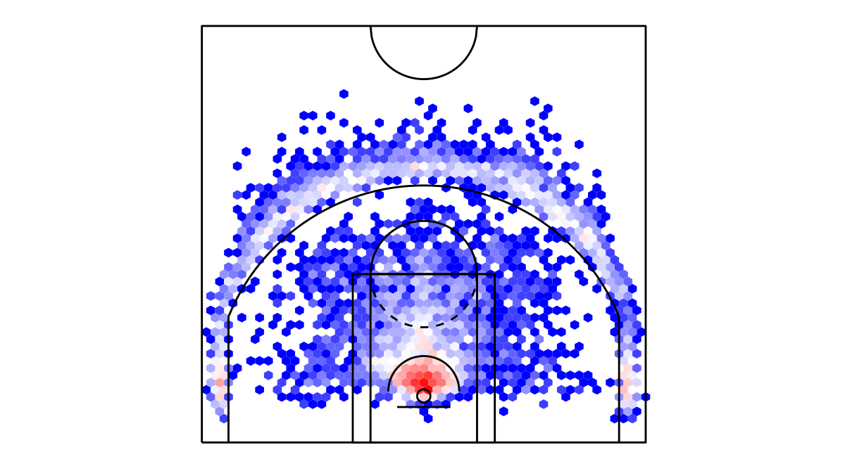 ヘックスビンマップ(Hexbin map)を用いたミネソタ・ティンバーウルブズのシュートチャートは下記の通り。シュートチャートの見方はこちら。