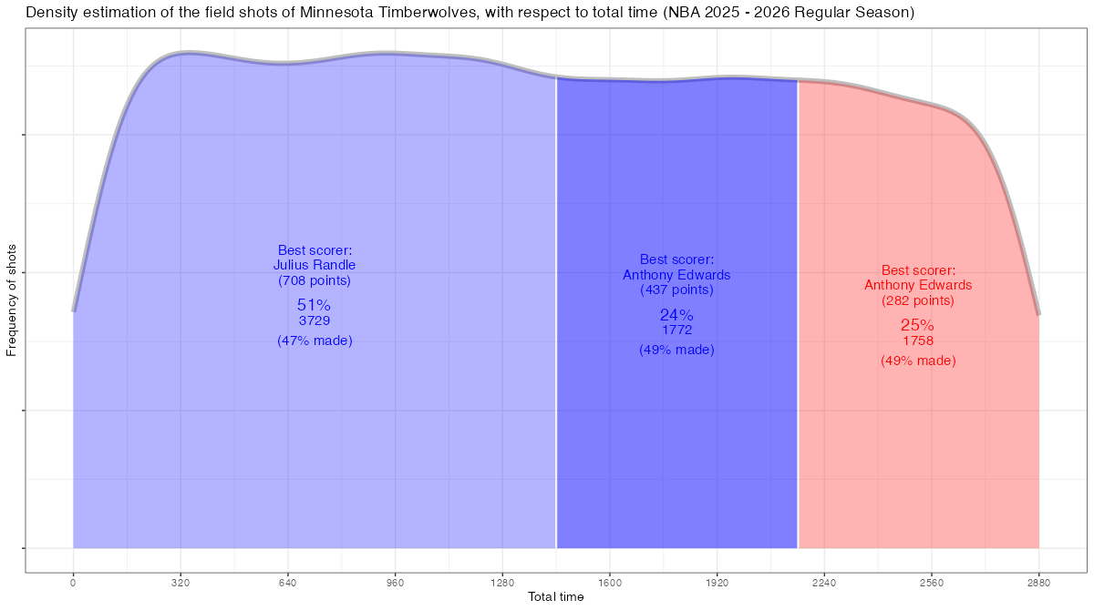 試合経過時間で見るミネソタ・ティンバーウルブズのフィールドショットの分布は下記の通り。分布図の見方はこちら。