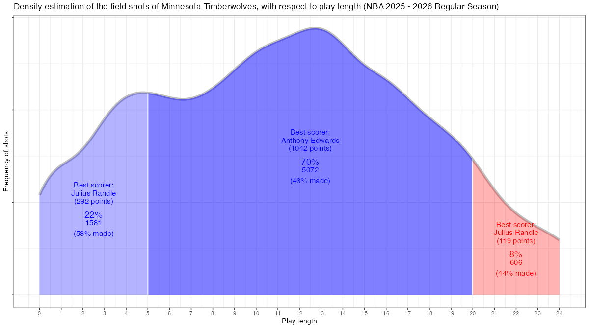 ショットクロックで見るミネソタ・ティンバーウルブズのスコアリング期待値の推移は下記の通り。分布図の見方はこちら。