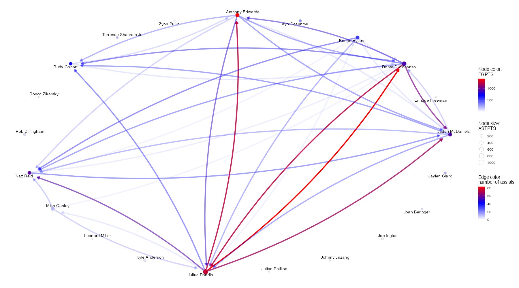 ミネソタ・ティンバーウルブズのアシストネットワークは下記の通り。グラフ内に示されている項目やグラフの見方はこちら。