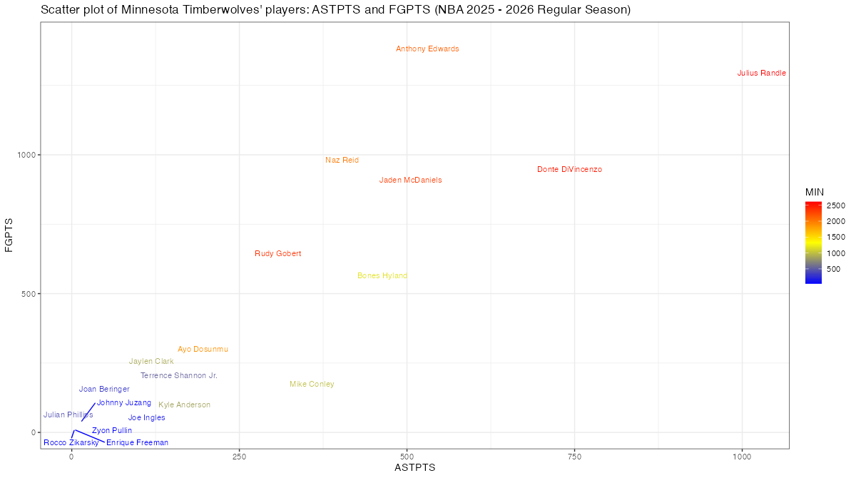 ミネソタ・ティンバーウルブズの所属プレイヤー(アルファベット順)のフィールドショットによる得点とアシスト関連スタッツは下記の通り。表中のFGPTS, FGPTS_AST, FGPTS_ASTp, AST, ASTPTSの内容はこちら。