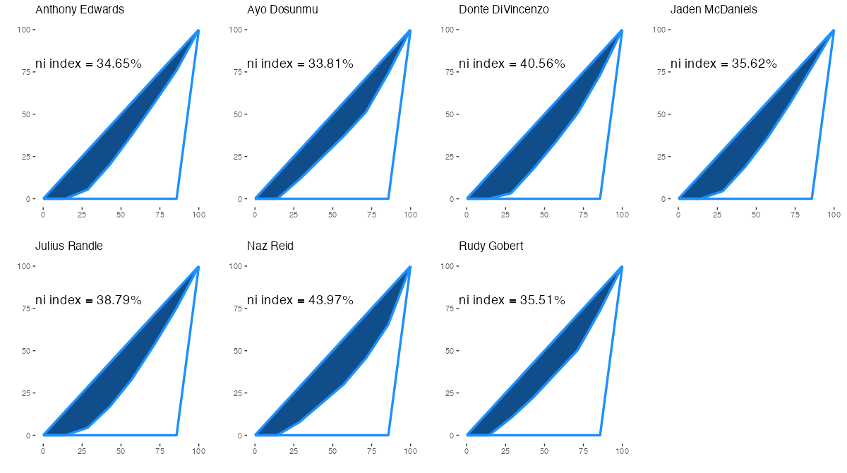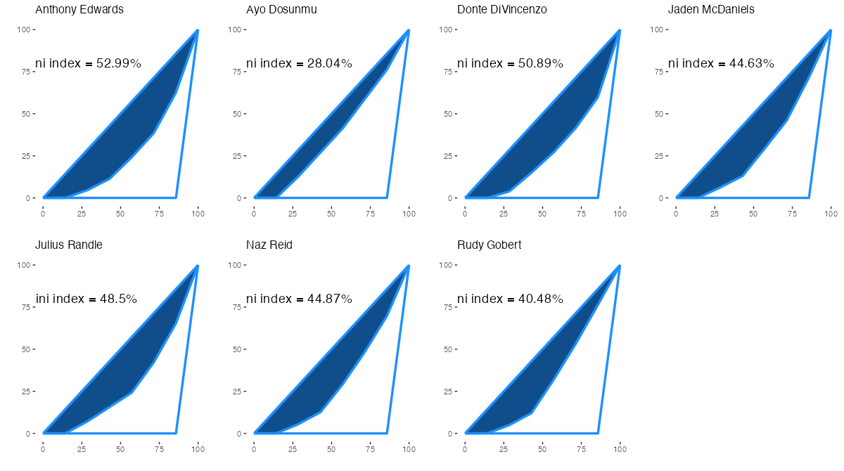 ミネソタ・ティンバーウルブズの所属プレイヤーについて、アシストを出した相手先の偏りを表すジニ係数は下記の通り。ジニ係数の内容は過去記事を参照。