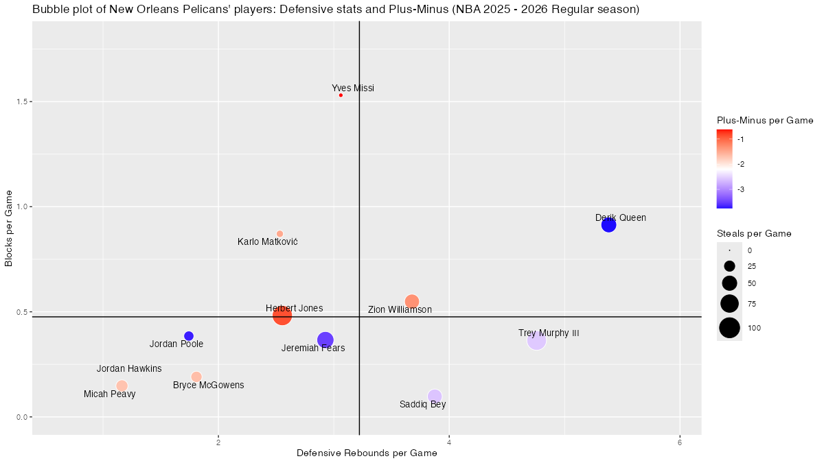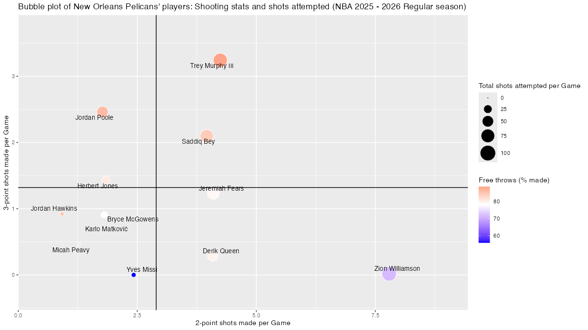 【ニューオーリンズ・ペリカンズ】基本スタッツを用いたプレイヤーのバブルチャート <NBA 2025 – 2026 Regular Season>