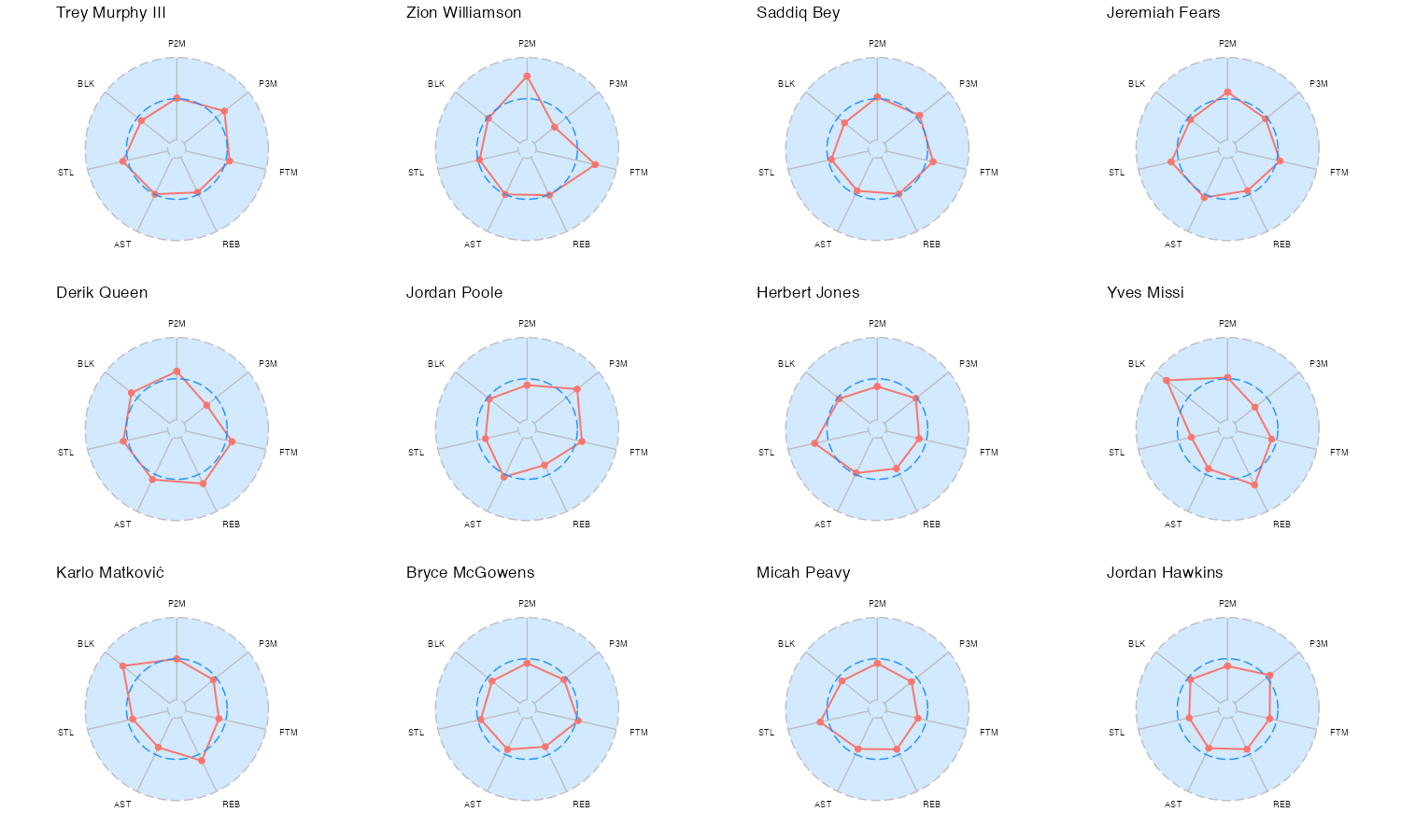 ニューオーリンズ・ペリカンズの所属プレイヤーのレーダーチャートは下記の通り。レーダーチャートの見方はこちら。基本スタッツの内容はこちら