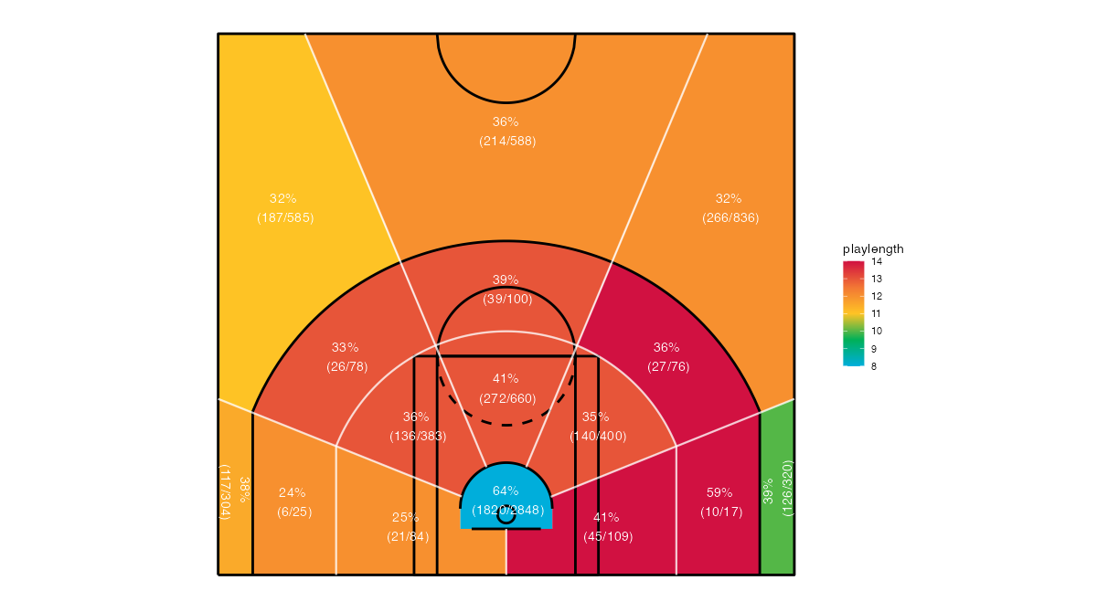 コートを16エリアに区分したニューオーリンズ・ペリカンズのシュートチャートは下記の通り。シュートチャートの見方はこちら